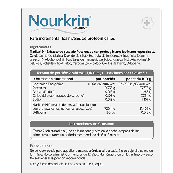 Valores por 2 tabletas (dosis diaria) Marilex® 600 mg Biotina 30 μg Lista de ingredientes (completa) Marilex® (Compuesto de proteoglicanos de origen marino), Extracto de cereza acerola (Malpighia punicifolia), Celulosa microcristalina, Dióxido de silicio