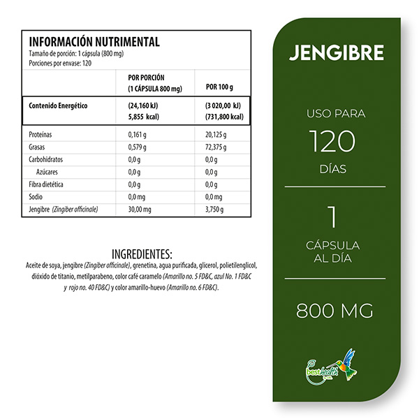 Aceite de soya, jengibre (zingiber officinale), grenetina, agua purificada, glicerol, polietilenglicol, dióxido de titanio, metilparabeno, color café caramelo (Amarillo no.5 FD&C, azul No.1 FD&C y rojo No.40 FD&C) y color amarillo-huevo (Amarillo No.6 FD&C).